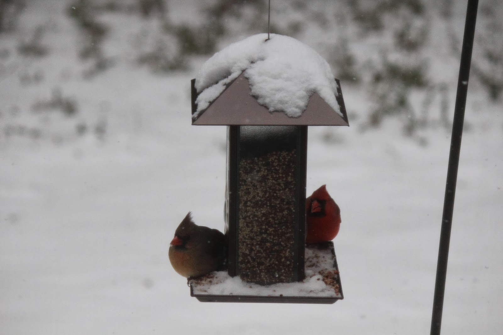 I took this picture today as it was snowing. I apologize for the quality of the image–I took it from inside through window glass and an outside screen.