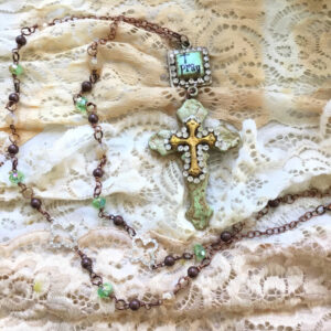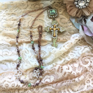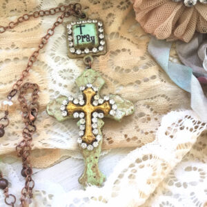 “Grandma’s Prayers” Clay Cross Stacked Cross Rhinestones Artisan Necklace-Moss Green