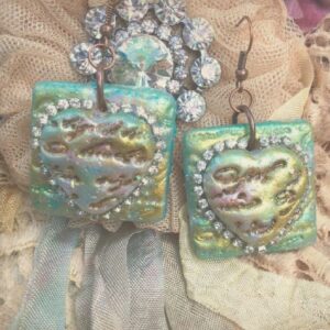“Heartfelt Blessings” Clay Heart Calligraphy Artisan Earrings Lagoon Blue