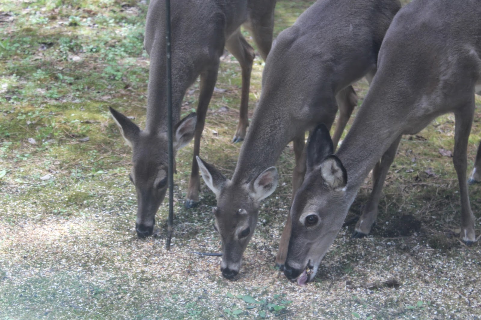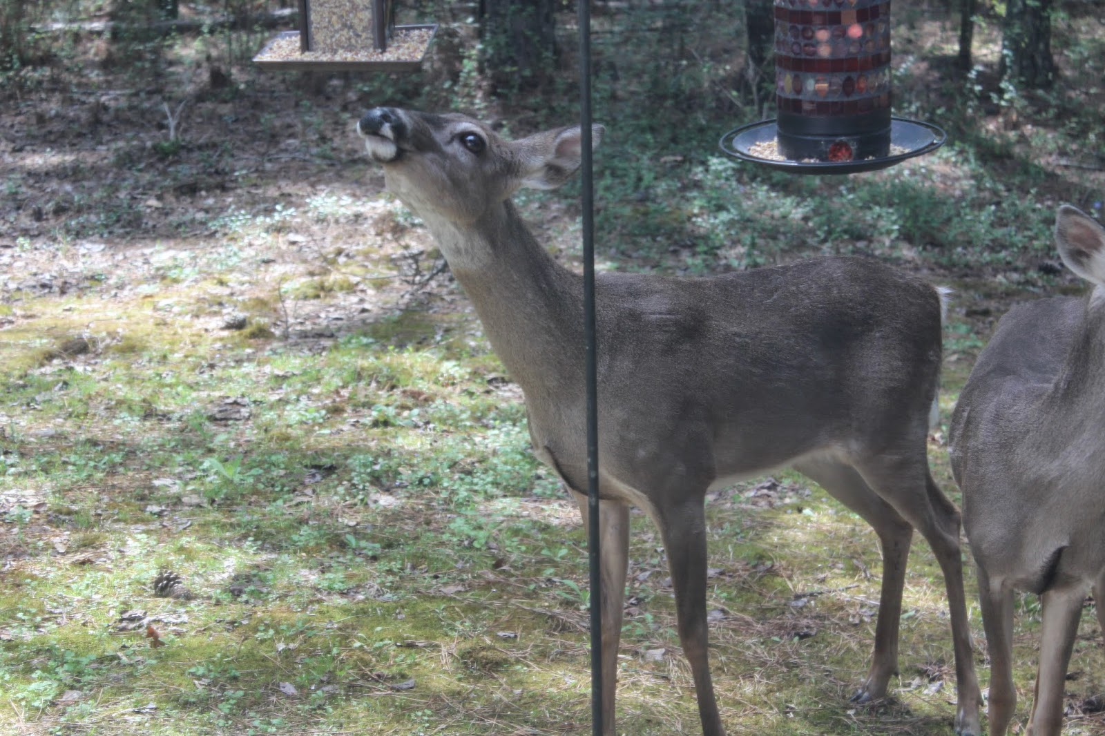 It is amazing how they have worked together so that all of them get some of the feed. One usually shakes or nudges one of the feeders (top photo) to shake some of the feed onto the ground. Then, several of them eat for a few minutes. Then, several more will come in and the first ones move out. And so it goes until all have eaten and they make their way into the woods again.