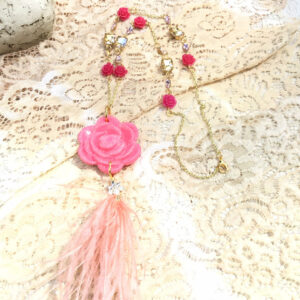 Old Glamour Rose Necklace With Roses, Rhinestones and Feathers